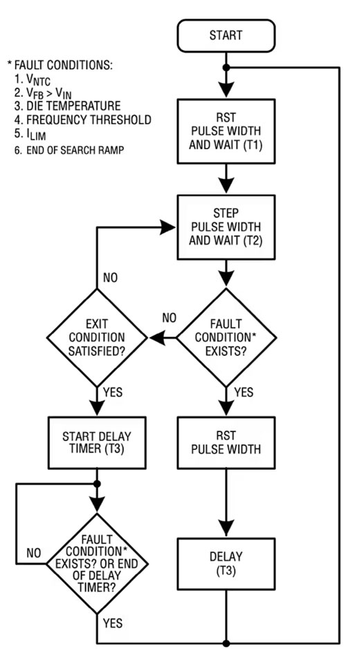 LTC4125 的最佳功率搜索功能通过固定流程执行每个搜索周期,直至检测到有效的退出条件或若干故障条件之一(图 6)。