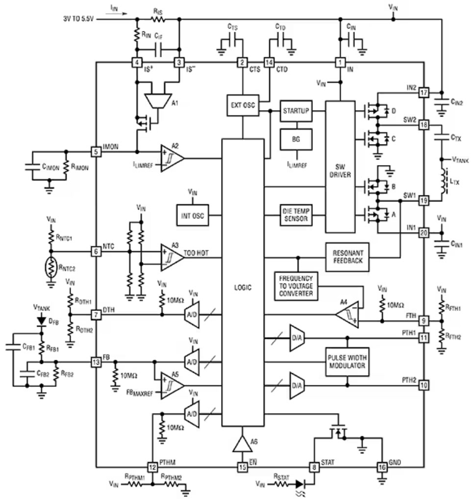 与 LTC4124 一样,LTC4125 也是一款专为 WPT 应用设计的高集成度器件。该器件采用 QFN 封装,尺寸为 5 × 4 × 0.75 mm,在 3 V 至 5 V 电源下输出功率超过 5 W(图 4)。