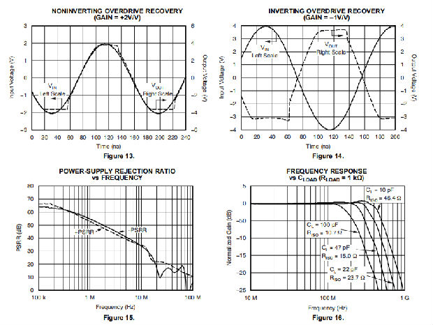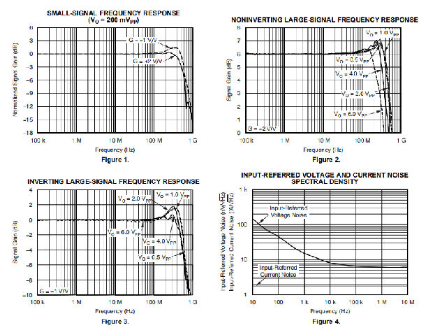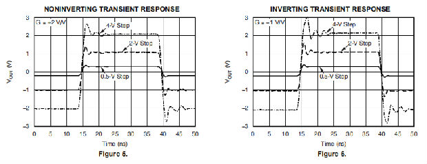 请注意,测试设备的72.3-Ω输入端接电阻器和50-Ω源阻抗将噪声增益修改为+1.84 V/V,并以+2 V/V的噪声增益对放大器进行最佳性能补偿。此补偿降低了相位裕度,并导致频率响应更高的峰值和更多的过冲/振铃在脉冲响应中。通过比较特征数据中的逆变和非逆变频率和脉冲响应图,可以看出这种影响。放大器相位裕度可以在使用逆变配置的应用中恢复,如果它是由非常低的阻抗源(如运算放大器)驱动的。