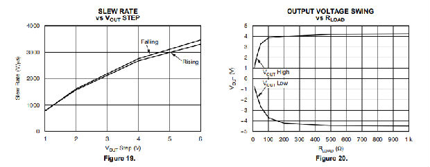 图21显示了作为典型特性基础的+2-V/V电路的非互易增益。大多数曲线的特征是使用具有50Ω驱动阻抗的信号源和显示50Ω负载阻抗的测量设备。在图21中,VIN+输入处的49.9-Ω并联电阻用于匹配测试发电机和电缆的源阻抗,而49.9-Ω系列输出电阻器VOUT为测量设备负载和电缆提供匹配阻抗。除非另有说明,否则数据表电压摆幅规格在非换向输入引脚VIN+或输出引脚VOUT处。