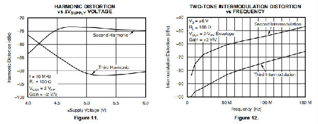 OPA653能够在高频下传输低失真。典型特征中的畸变图显示了各种情况下的典型畸变。通常,使用更高的电源电压(建议使用±6V)、较低的输出电压波动和较低的负载可获得最佳的失真性能。