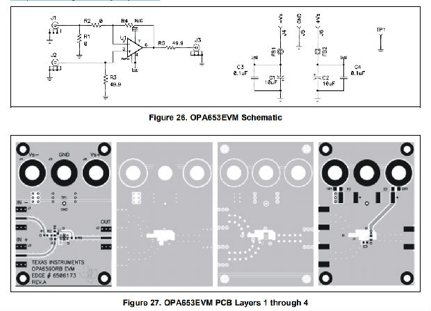 图26是OPA653EVM示意图。PCB的第1层到第4层如图27所示。建议尽量遵循放大器附近外部部件的布局、接地层结构和电源布线。
