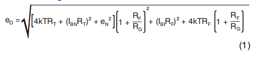 将该表达式除以噪声增益=1+RF/RG,得到无反转输入时的等效输入参考点噪声电压,如等式2所示:
