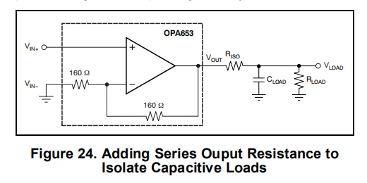 对运算放大器来说,最苛刻也是最常见的负载条件之一是电容性正在加载OPA653非常坚固,但在轻负载情况下应小心,这样输出电容不会导致稳定性降低、频率响应峰值增加、过冲,以及铃声。什么时候考虑到放大器的输出电阻,电容负载在信号通路中增加了一个极点,减小了相位裕度。对于标准运算放大器,有几种外部解决方案可以解决这个问题。因为OPA653有内部增益设置电阻,唯一的选择是使用串联输出电阻。此选项是一个很好的解决方案,因为当主要考虑频率响应平坦度、脉冲响应保真度和/或失真时,串联输出电阻是最简单和最有效的技术。其思想是通过在放大器输出和电容性负载之间插入一个串联隔离电阻RISO,将电容性负载与反馈回路隔离,如下图24所示。实际上,这种结构将相移与放大器的环路增益隔离,从而恢复相位裕度并提高稳定性。