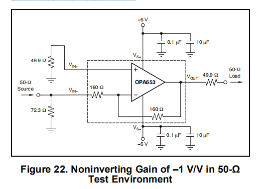 图22显示了OPA653在50Ω测试环境中的非转换增益为-1 V/V配置,用于测试典型特性。电路操作与图21基本相同,只是在VIN输入和接地之间使用了一个72.3-Ω的端接电阻器,因此与增益设置电阻器(RG=160Ω)一起,输入阻抗约为50Ω。作为预防措施,VIN+输入端接至接地,使用49.9-Ω电阻器,以避免输入端的单晶体管振荡;该值并不重要,但应注意避免较大的值,因为噪声的影响如下所述。