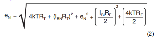 在方程2中加入高电阻值可以很快控制总等效输入参考噪声。由于增益设置电阻RF和RG是器件内部的,用户不能改变这种噪声贡献,噪声增益等于+2v/V。