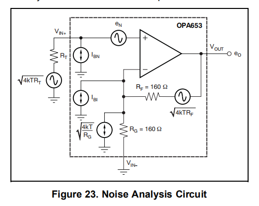 OPA653提供低输入噪声电压图23显示了包含所有噪声项的运算放大器噪声分析模型。在这个模型中,所有的噪声项都被认为是以nV/√Hz或pA/√Hz表示的噪声电压或电流密度项。
