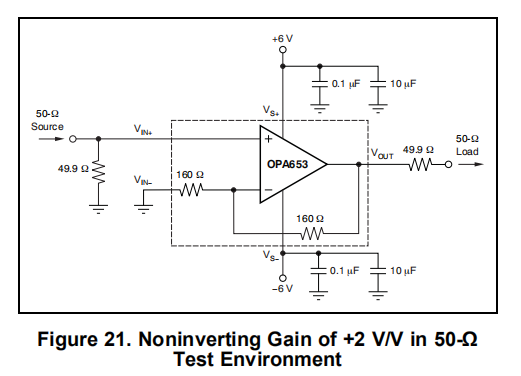 但是,应注意RT值或其他源阻抗对不可逆性的影响输入。高-非转换输入上的电阻阻抗值会增加显著的噪声;例如,2.4 kΩ会增加一个等于放大器本身的约翰逊电压噪声项(6.2 nV/√Hz)。因此,虽然OPA653的JFET输入非常适合于图21所示的无反转配置中的高源阻抗应用,但整体带宽和噪声受到高源阻抗的限制。