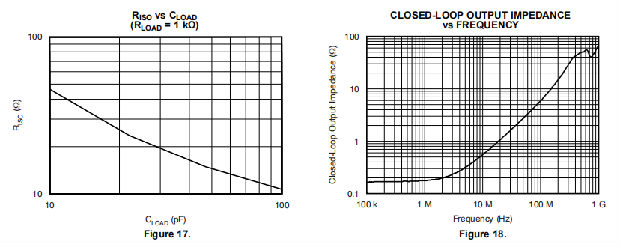 d) 与板上其他宽带设备的连接可以通过短的直接记录道或通过板载传输线进行。对于短连接,将跟踪和到下一个设备的输入视为集中电容负载。应使用相对较宽的痕迹(50密耳至100密耳,或1.27厘米至2.54厘米)。估计总电容性负载,并根据推荐的RISO与电容性负载的关系图设置RISO(图17)。低寄生电容性负载(小于5 pF)可能不需要RISO,因为OPA653名义上是补偿的,可以在2-pF寄生负载下工作。