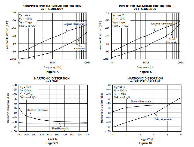 电源解耦对谐波失真性能至关重要。特别是,为了获得最佳的二次谐波性能,高频0.1-μF电源去耦电容器应尽可能靠近电源的正、负极引脚,并应将其置于远离输入引脚的单点接地上。