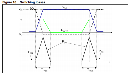 其中TRISE和TFALL是电源开关(VDS)上电压的重叠时间以及在打开和关闭阶段流入它的电流,如图16所示。TSW是等效的切换时间。对于该装置,等效装置的典型值切换时间为50ns。c) 静态电流损耗,计算如下: