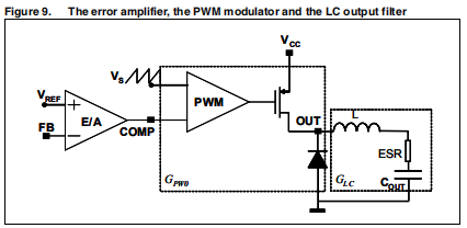 补偿网络必须保证稳定性和良好的动态性能。循环基于电压模式控制。误差放大器是一个电压高带宽运算放大器。所以选择补偿网络E/A将被认为是理想的,即其带宽比系统带宽大得多。研究了PWM调制器和输出LC滤波器的传递函数。这个从误差放大器输出(补偿引脚)到输出引脚,结果: