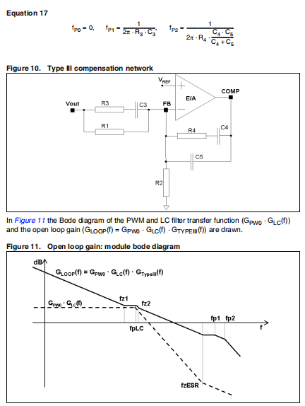 稳定回路的方法包括放置两个零点以补偿影响LC双极,因此增加相位裕度;然后在原点放置一个极将稳压输出电压上的直流误差降到最小;最后将其他极远离零分贝频率。如果输出电容器的等效串联电阻(ESR)引入零,则频率高于所需带宽(即:2π*ESR*COUT<1/BW),III型需要补偿网络。多层陶瓷电容器(MLCC)具有很低的ESR(<1MΩ),频率零点非常高,因此采用III型网络对循环。图10显示了III型补偿网络。这个网络引入了两个0(fZ1、fZ2)和三极(fP0、fP1、fP2)。它们的表达是: