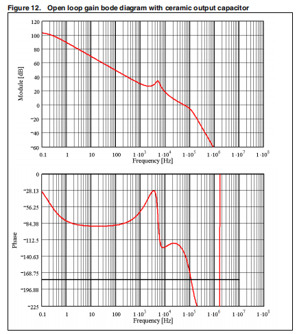 图15显示了开环增益的模块和相位。带宽大约是35khz,相位裕度为49°。