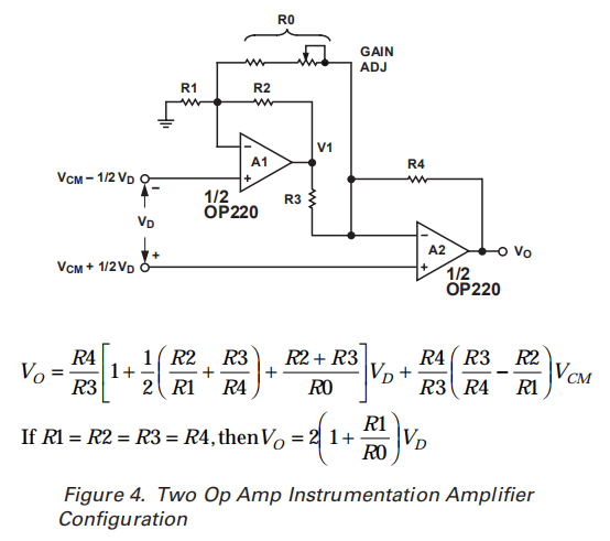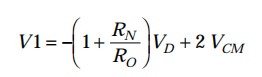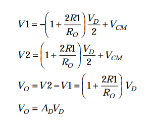 差分增益AD为1+2R1/RO,共模输入VCM被拒绝。