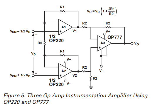 这三个运算放大器仪表放大器配置在输入端使用一个OP220,在输出端使用一个OP777,在很宽的增益范围内提供了出色的性能,功耗非常低。增益范围为1到2000是可行的,超过120分贝的共模比是容易实现的。