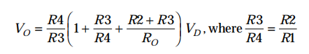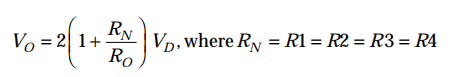 输入电压表示为共模输入VCM加上差分输入VD。使比率R3/R4等于比率R2/R,以拒绝共模输入VCM。然后根据以下条件放大差分信号VD: