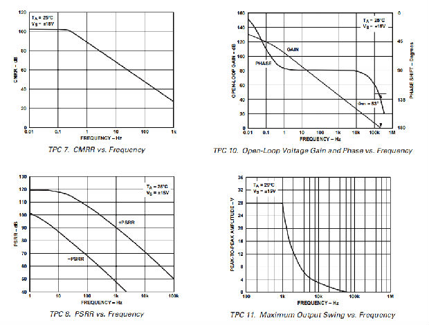 在这种仪表放大器配置中,由于CMRR效应引起的误差与运算放大器的差分CMRR成正比。对于OP220A/E,该组合CMRR最小为98 dB。组合的CMRR值为100db,共模输入范围为±2.5v,表明峰值输入误差仅为±25mv。