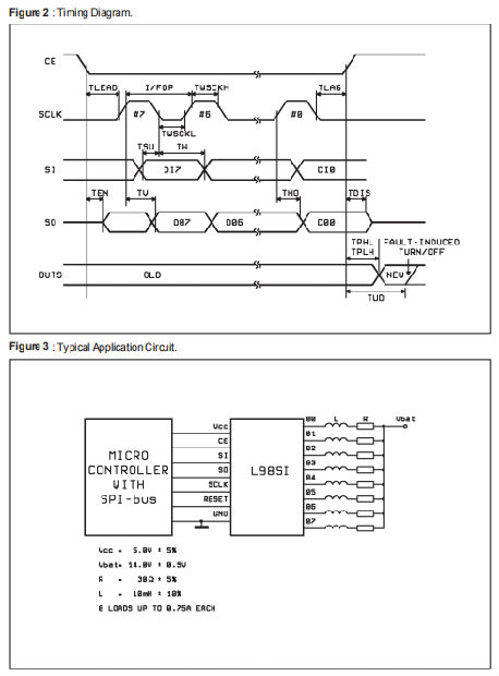 输出级提供主动低驱动信号适用于0.75A连续负载。每个输出有一个电流限制电路输出电流至少为1.05A,以允许高in 急流。另外,输出内部齐纳值设置为36伏以钳制感应瞬变在关闭时。每个输出也有一个电压比较表输出节点。如果on输出引脚上的电压超过1.8V,则故障为假设和锁闩驱动这个特定的阶段复位,关闭输出以保护它。此操作的说明如下。这些组件还提供诊断反馈数据给转变注册。另外,比较器为台南内部下拉电流如果输出为程序关闭,输出引脚开路。定时数据传输图2显示了使用SPI与L98SI进行字节传输公共汽车。