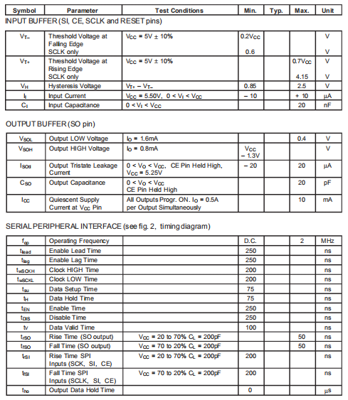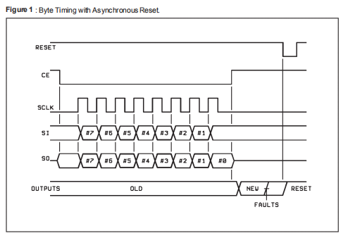 当芯片启用(CE)引脚为拉低。Thetri-stateSerialOutput(SO)引脚驱动程序将使CE较低的时间成为可能。在CE引脚的边缘,诊断数据来自输出级中的电压比较器将接入移位寄存器。如果特定输出是高,一个逻辑信号会被塞进移位寄存器。如果输出低,逻辑零将在这里装的最重要的位(07)应该是显示串行输入(SI)引脚。一个零引脚将编程一个输出,而一个将编程输出关闭。