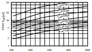 请注意,R1和R2会导致内部调节器。因此,为了使功耗最小化,请遵循以下公式:(R1+R2)>500千欧在实际设计中,由于内部电路延迟,电流峰值往往高于估计值。这一点很明显在高di/dt条件下,这可能是由高VBB或低线圈电感。对于电阻RS,因为输出电流运行通过它,使用一个比功耗。这些决定了PWM关断时间,TPOFF。图2显示基于不同Coff和Roff值的PWM关断时间曲线。在推荐值下,PWM关闭时间约为20μs:Roff=560 kΩ,Coff=220 pF。