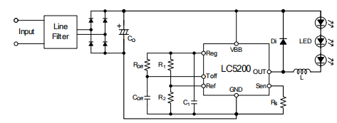 该元件的电感越高,纹波振幅越小输出电流有。一般情况下,建议0.5至20 mH。还要确保线圈在纹波峰值处不会饱和电流。饱和会导致高浪涌电流LED或设备损坏。二极管提供再循环电流的通路。如果二极管使用慢恢复特性时,会引起浪涌MOSFET开启时的电流,以及噪声增加和可能导致设备故障。此外,它还可以提高效率放下。因此,桑肯RL3A超快恢复二极管,或建议使用具有更好或同等恢复特性(50ns)的二极管。这是主电源整流电容器。这个电容越大,产生的纹波电压越小。此外,由于较高的输出功率会导致纹波电压的增加,因此应为输出功率选择适当的电容值。即使电容很低(比如1000 pF)和纹波电压升高,装置工作。这也使得一种非电解电容器设计,可延长单位寿命和减少单位规模和成本。但是,如果纹波电压低于LC5200 UVLO阈值,或低于LED串的电压降时,LED会转动在那段时间里。C1该电容器用于稳定内部调节器电路操作。将一个0.1μF电容器尽可能靠近设备可能是为了正确操作MOSFET。使用电容值导致开关速度慢和故障,但电容值过大则启动缓慢。