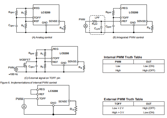 PWM集成控制,输入外部PWM信号通过低通滤波器(LPF)并将输出连接到参考销(图6,面板B)在这两种方法中,TOFF pin电压被用来转动MOSFET开或关,因此,电路如图6所示,面板C还可以通过外部信号调节输出电流。在这种应用,当外部小信号MOSFET转动时开启时,LC5200停止输出脉冲。
