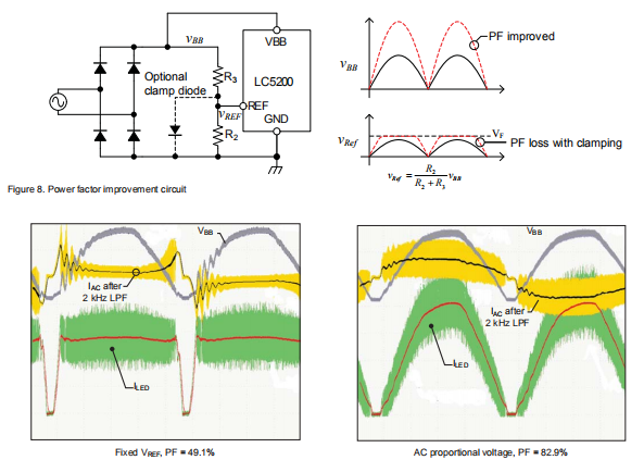 使LED电流与交流输入电压成比例提高了功率因数,可以用LC5200实现系列参考引脚功能。图8显示了应用电路。没有交流整流电容器,R2和R3将交流电压产生一个比例低的电压作为交流电压对于参考销。这样,LED电流跟随交流电压塑造并提高功率因数。如果参考电压波动范围大,将钳位二极管与R2并联,以保护REF引脚。在这种情况下,参考电压会发生畸变(图8中的波形较低)并可能导致功率因数减少。图9显示了实际操作波形。展板A显示在固定参考引脚电压下运行,面板B显示交流比例参考引脚电压下的操作。对于这两种操作,没有使用交流整流电容器。黄色波形为交流输入电流,黑色波形为2 kHz低通滤波波形。在面板B中,电流形成正弦波形,这意味着功率因数提高了。