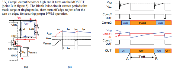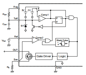 MOSFET打开。在固定的关闭时间之后,由外部电容和电阻在Toff引脚,MOSFET转动再次打开,并重复上述操作。图4显示了电流控制电路,图5显示了电路的时序图。当MOSFET打开时,两者穿过传感电阻器RS的负载电流和VSen增加。VSen和VSen的输出是相反的>VRef(见图5中的A点)。这将重置后一个RS闩锁并它导致在信号通过后关闭MOSFET几个逻辑电路。同时,Toff引脚上的Coff由内部MOS开关充电,当补偿逆变输入(与Toff引脚相连)电压低于2 V时,Comp1输出是反向的,它设置RS锁存器。这关了MOS开关,并通过Roff启动Coff的充电过程。Coff电压(Toff pin)随着它的增加而增加,当它的电压达到3伏,Comp1输出变高,它打开MOSFET(图5中的B点)。空白脉冲电路产生的周期掩模浪涌或响声,从关闭边缘到刚刚结束打开edge,以确保正确的PWM操作。