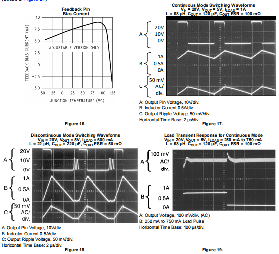 (3) 外部元件,如捕捉二极管、电感器、输入和输出电容器以及电压编程电阻器都会影响开关调节器系统性能。当使用LM2595时,如图21测试电路所示,系统性能将如电气特性部分的系统参数所示。