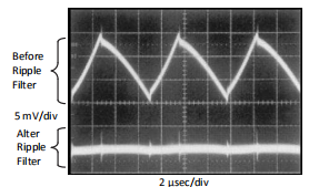 在连续模式下工作的开关电源的输出电压将包含锯齿波切换器频率下的电压,也可能包含锯齿波峰值处的短电压尖峰波形。输出纹波电压是电感器锯齿波电流和输出ESR的函数电容器。典型的输出纹波电压范围约为输出电压的0.5%至3%。到获得低纹波电压时,输出电容器的ESR必须很低,但是,当使用极低ESR电容器,因为它们会影响回路稳定性,导致振荡问题。如果需要极低的输出纹波电压(小于20毫伏),建议使用后纹波滤波器。(见图21。)所需的电感通常在1μH到5μH之间,直流电阻较低,以保持良好的负载法规。低ESR输出滤波器电容器也需要确保良好的动态负载响应和纹波减少。这个电容器的ESR可能是期望的低,因为它在调节器反馈回路之外。图30所示的照片显示了一个典型的输出纹波电压,有或没有后纹波滤波器。当用示波器观察输出纹波时,必须将一个短的、低电感的示波器探头接地使用连接。大多数示波器探头制造商提供一种特殊的探头终端,焊接在上面调节板,最好在输出电容器处。这提供了一个非常短的范围接地,从而消除了与探针通常配备的3英寸接地线相关的问题纹波电压波形更清晰、更准确。
