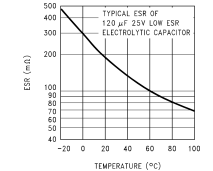 需要一个输出电容器来过滤输出并提供调节器回路的稳定性。低阻抗或必须使用设计用于开关调节器应用的低ESR电解或固体钽电容器。当选择输出电容器时,重要的电容器参数是:100 kHz等效系列电阻(ESR)、均方根纹波电流额定值、电压额定值和电容值。对于输出电容器,ESR值是最重要的参数。输出电容器需要一个有上限和下限的ESR值。对于低输出纹波电压,a需要低ESR值。该值由最大允许输出纹波电压确定,通常为1%输出电压的2%。但如果所选电容器的ESR极低,则有可能反馈回路不稳定,导致输出振荡。使用表中列出的电容器,或类似类型,将提供所有条件下的设计解决方案。如果需要非常低的输出纹波电压(小于15毫伏),请参阅输出电压部分后纹波滤波器的纹波和瞬态。铝电解电容器的ESR值与电容值及其额定电压有关。在大多数情况下在这种情况下,较高电压的电解电容器的ESR值较低(见图27)。通常,电容器可能需要更高的电压额定值,以提供低输出纹波电压所需的低ESR值。在许多不同的开关设计中,输出电容往往只能满足三个或四个不同的电容值和几种不同的额定电压。请参见中的快速设计组件选择表表2和表4列出了典型的电容器值、电压额定值和制造商的电容器类型。电解电容器不建议用于温度低于−25°C的环境中。冷态时,ESR急剧上升温度通常在−25°C时升高3倍,在−40°C时升高10倍。见图28所示曲线。