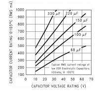 CIN-在输入引脚和接地引脚之间需要一个低ESR的铝或钽旁路电容器。它必须使用短导线位于调节器附近。该电容器可防止大电压瞬变出现在输入端,并提供每次开关打开时所需的瞬时电流。输入电容器的重要参数是电压额定值和均方根电流额定值。因为在降压调节器的输入电容器中流动的相对较高的均方根电流,应选择该电容器其均方根电流额定值而不是其电容或电压额定值,尽管电容值和电压额定值与均方根电流额定值直接相关。电容器的均方根电流额定值可以看作是电容器的额定功率。均方根电流通过电容器内部的ESR产生功率,使电容器的内部温度站起来。电容器的均方根电流额定值由提高内部电流所需的电流量决定温度比环境温度105℃高出约10℃。电容器的消散能力对周围空气的热量将决定电容器能够安全承受的电流量。电容器物理尺寸大,表面积大,通常具有较高的均方根电流额定值。为了一个给定的电容值,较高电压的电解电容器在物理上比低压电容器大,并且因此能够向周围空气散发更多热量,因此具有更高的均方根电流额定值。如果电解电容器的额定电流高于均方根值,则会缩短操作时间生活。较高的温度会加速电容器电解液的蒸发,最终导致故障。选择输入电容器需要咨询制造商的数据表,以获得最大允许有效值纹波电流。对于40°C的最高环境温度,一般指导原则是选择具有纹波电流额定值约为直流负载电流的50%。环境温度高达70°C时,a对于保守的设计,额定电流为直流负载电流的75%是一个不错的选择。电容器额定电压必须至少是最大输入电压的1.25倍,而且通常要高得多电压电容器需要满足均方根电流的要求。图26所示的图表显示了电解电容器值、其额定电压和额定的均方根电流。这些曲线是从低ESR、高ESR的Nichicon“PL”系列获得的为开关调节器应用设计的可靠性电解电容器。其他电容器制造商提供类似类型的电容器,但一定要检查电容器数据表。“标准”电解电容器通常具有更高的ESR值、更低的均方根电流额定值和通常使用寿命较短。