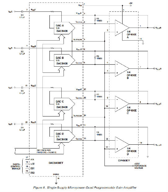 四路OP490和DAC8408四路8位CMOS DAC的组合,创建了一个静态电源漏极只有140毫安的四路可编程增益放大器。DAC中的数字代码,很容易被微处理器设置,它决定了固定的DAC反馈电阻与DAC梯形图的电阻之间的比率,DAC梯形图呈现给运算放大器反馈回路。每个放大器的增益为: