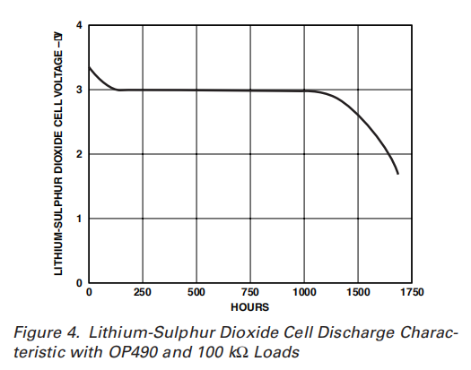 高性能便携式设备和仪器经常使用锂电池,因为与旧的原电池相比,锂电池的保质期长、重量轻、能量密度高。大多数锂电池的标称输出电压为3V,以平坦放电特性著称。OP490的低供电电流要求,加上锂电池的平坦放电特性,表明OP490可以在电池的整个使用寿命内运行。图4显示了1 Ah锂电池的典型放电特性,OP490和每个放大器依次驱动输出摆幅到100 kW负载。