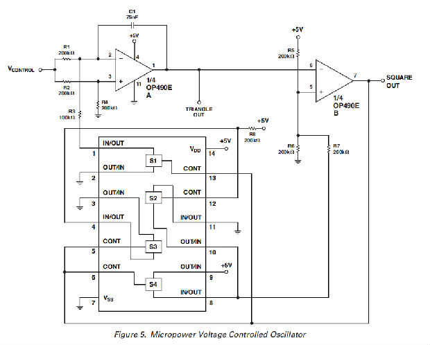 OP490与廉价的四芯CMOS开关组合构成图5中的精密VCO。该电路提供三角形和方波输出,仅从5伏电源中提取75毫安。A充当积分器;S1对称地切换充电电流以产生正、负斜坡。积分器以B为界,B作为施密特触发器,精确滞后为1.67V,由电阻R5、R6和R7以及相关CMOS开关设置。A的输出为三角波,上下电平分别为3.33V和1.67V。B的输出为方波,几乎有轨对轨摆动。如图所示,操作频率由以下等式给出: