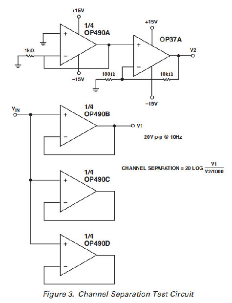 OP490使用PNP输入级,保护电阻与逆变和非逆变输入串联。PNP晶体管的高击穿与保护电阻相结合,提供了大量的输入保护,允许在不损坏放大器的情况下,在任何一个电源的情况下,输入都可以超过20 V。