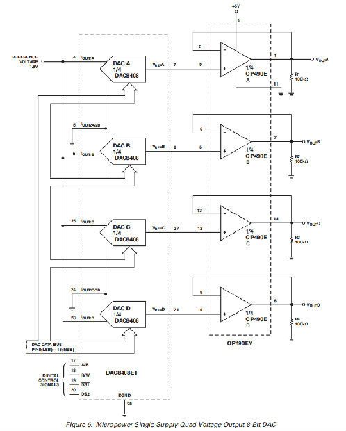 图6中的电路使用dac8408cmos四位8位DAC和OP490形成一个电源漏极仅为140ma的单电源四电压输出DAC。DAC8408用于电压开关模式,每个DAC都有一个输出电阻(™10 kW)独立于数字输入代码。输出放大器充当缓冲器,以避免加载dac。100 kW电阻器确保OP490输出在需要时摆动低于0.8 V。
