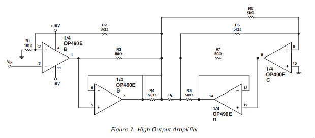 图7中所示的放大器能够驱动25V p-p到1kW负载。放大器的设计基于电桥结构。A在B的帮助下放大输入信号并驱动负载。放大器C是一个单位增益逆变器,它借助D驱动负载。高输出放大器的增益(显示的组件值)为10,但可以通过改变R1或R2轻易改变。