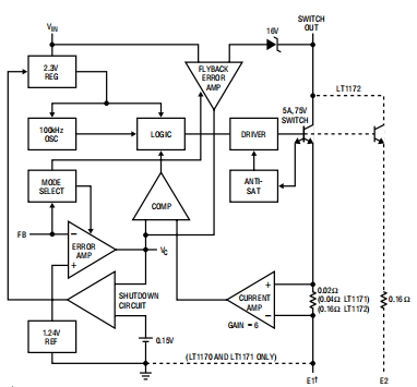 内部5A开关(LT1171为2.5A,LT1172为1.25A)