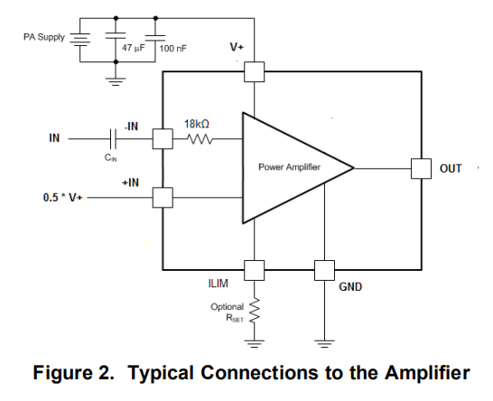 例如,将CIN设置为3.3 nF会导致2.9 kHz的高通截止频率。必须确定CIN的额定电压,以承受高达PA电源电压的操作。