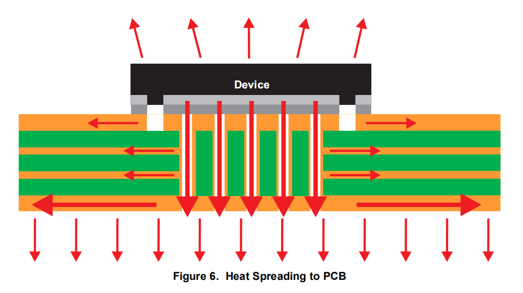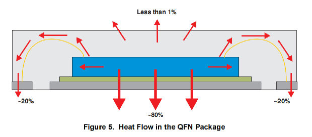 外露的热焊盘必须焊接到PCB热焊盘上。PCB上的热垫必须与QFN封装下面的外露热垫尺寸相同。请参阅QFN/sonpcbtachment,以获取将热垫连接到PCB的建议。图6显示了从设备到PCB的热扩散方向。