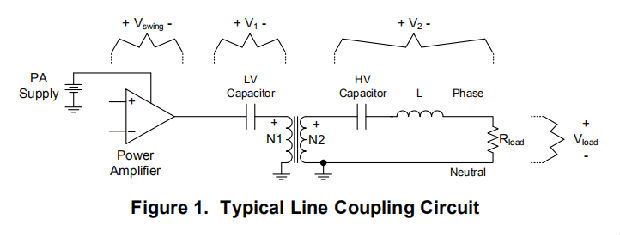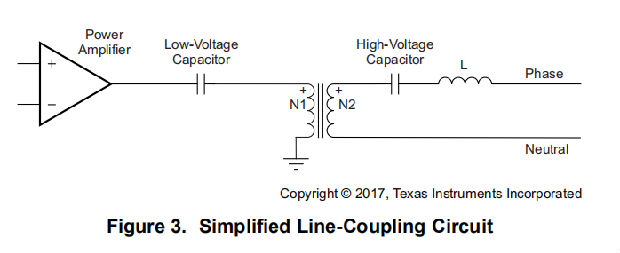 线路耦合电路是电力线调制解调器中最关键的电路之一。线路耦合电路阻止电源的低频信号(通常为50赫兹或60赫兹)损坏低压调制解调器电路,并将调制解调器信号与交流电源连接。图3显示了一个典型的线路耦合电路。