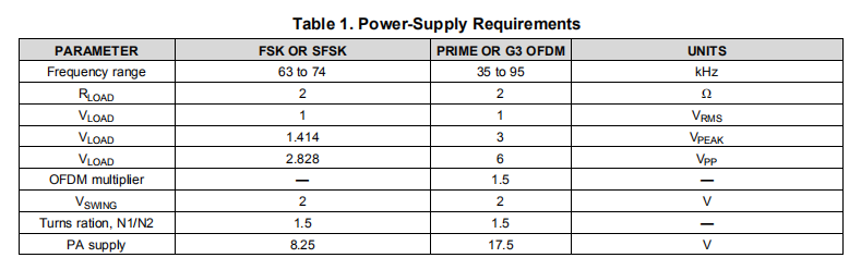 对于使用具有2Ω负载和1-Vrms负载电压的OFDM信号的PRIME或G3: