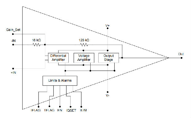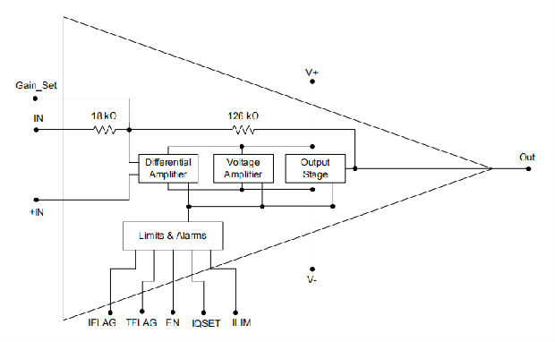 OPA521提供可选的输出电流限制(ILIM)、静态电流(IQSET)选择引脚和设备启用引脚。IFLAG输出警报引脚指示输出电流警告,当设备内部温度迫使设备关闭时,TFLAG警报触发。