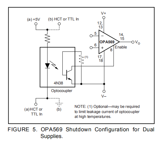 在图5所示的配置(a)中,启用/禁用信号应用于光耦内光电二极管的阴极侧。逻辑高电平使OPA569被启用,逻辑低电平使OPA569无效。在图5的配置(b)中,逻辑信号施加在阳极侧,高电平禁用OPA569,低电平启用运算放大器。