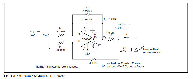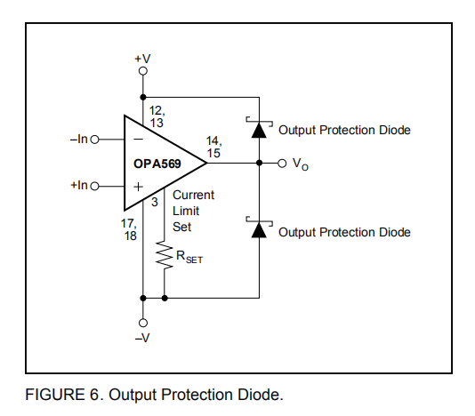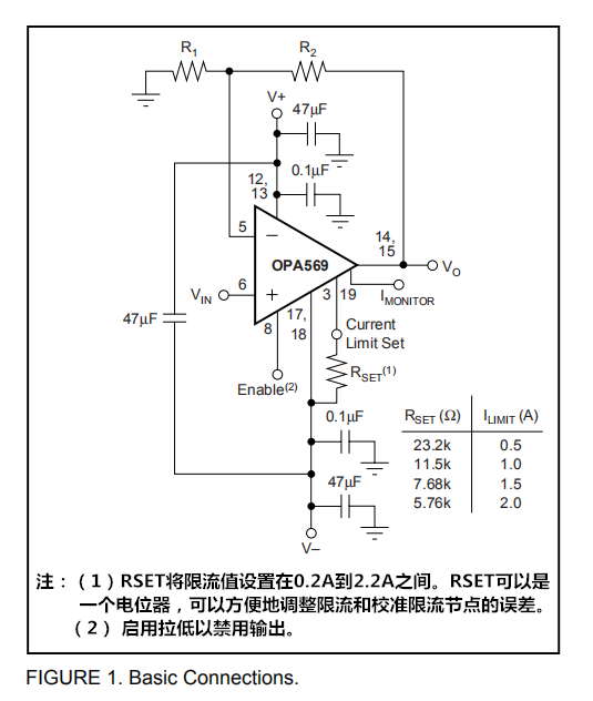 图1显示了作为基本的非转换放大器连接的OPA569;然而,OPA569实际上可以用于任何运算放大器配置。电流限制设置电阻器(RSET,图1)对OPA569的运行至关重要,不能省略。