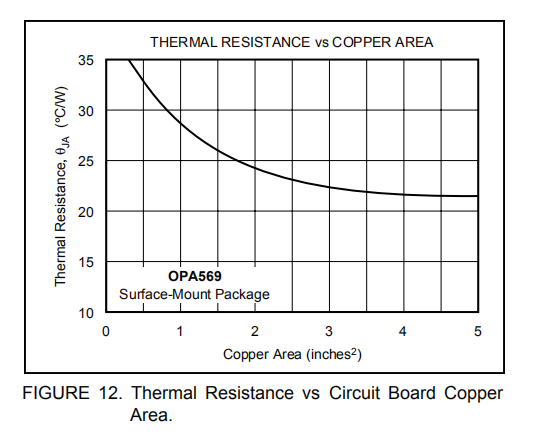 当焊接到2oz铜平面时,OPA569与环境热阻(θJA)值为21.6°C/W。通过添加强制空气,该值可进一步降低至12°C/W。图10显示了DWP-20封装的结-环境热阻。