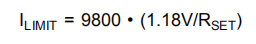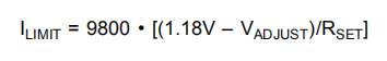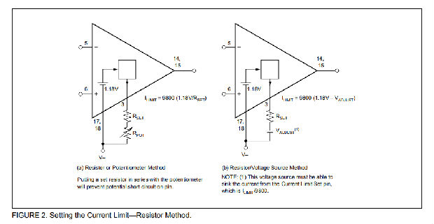 如图2所示,设置电流限制的最简单方法是根据以下公式,在电流限制设定引脚和负极电源V–(负极电源)之间连接一个电阻器或电位计: