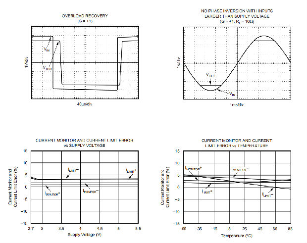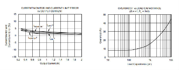 使用电流监视器功能时,有些限制适用。当主放大器是源电流时,电流监测电路必须是源电流。同样地,当主放大器是下沉电流时,电流监视器电路也必须是下沉电流。此外,IMONITOR引脚上的摆动小于输出摆动。当放大器提供电流时,电流监视器引脚的电压必须至少比放大器的输出电压低200毫伏。相反地,当放大器正在吸收电流时,电流监视器引脚的电压必须至少比放大器的输出电压大200毫伏。电阻负载能够满足这些限制。其他类型的负载可能会导致无效的电流监视器值。